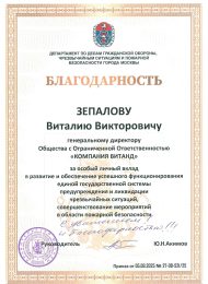 Благодарность от Департамента ГО, ЧС и ПБ Москвы